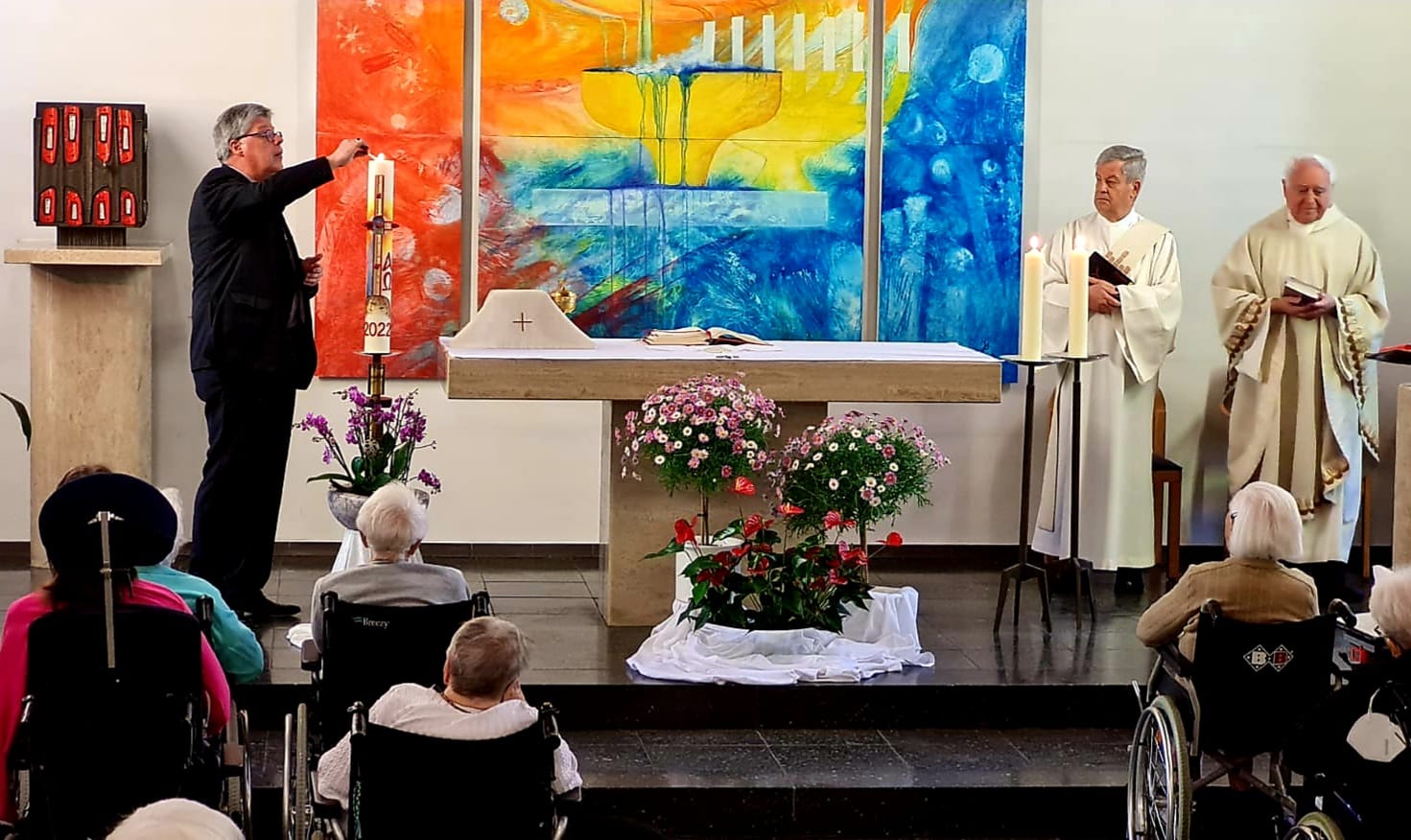 Pastor Hermann Josef Reckenthäler, in Begleitung von Diakon Wilhelm Kunzen, zelebrierte das Fest der Auferstehung in der Hauskapelle von St. Josef. Joachim Wagner, Vorsitzender der Pfarreiengemeinschaft Schweich, brachte das Osterlicht aus der Pfarrkirche und entzündete damit zu Beginn des Hochamtes die Osterkerze in der Hauskapelle von St. Josef.