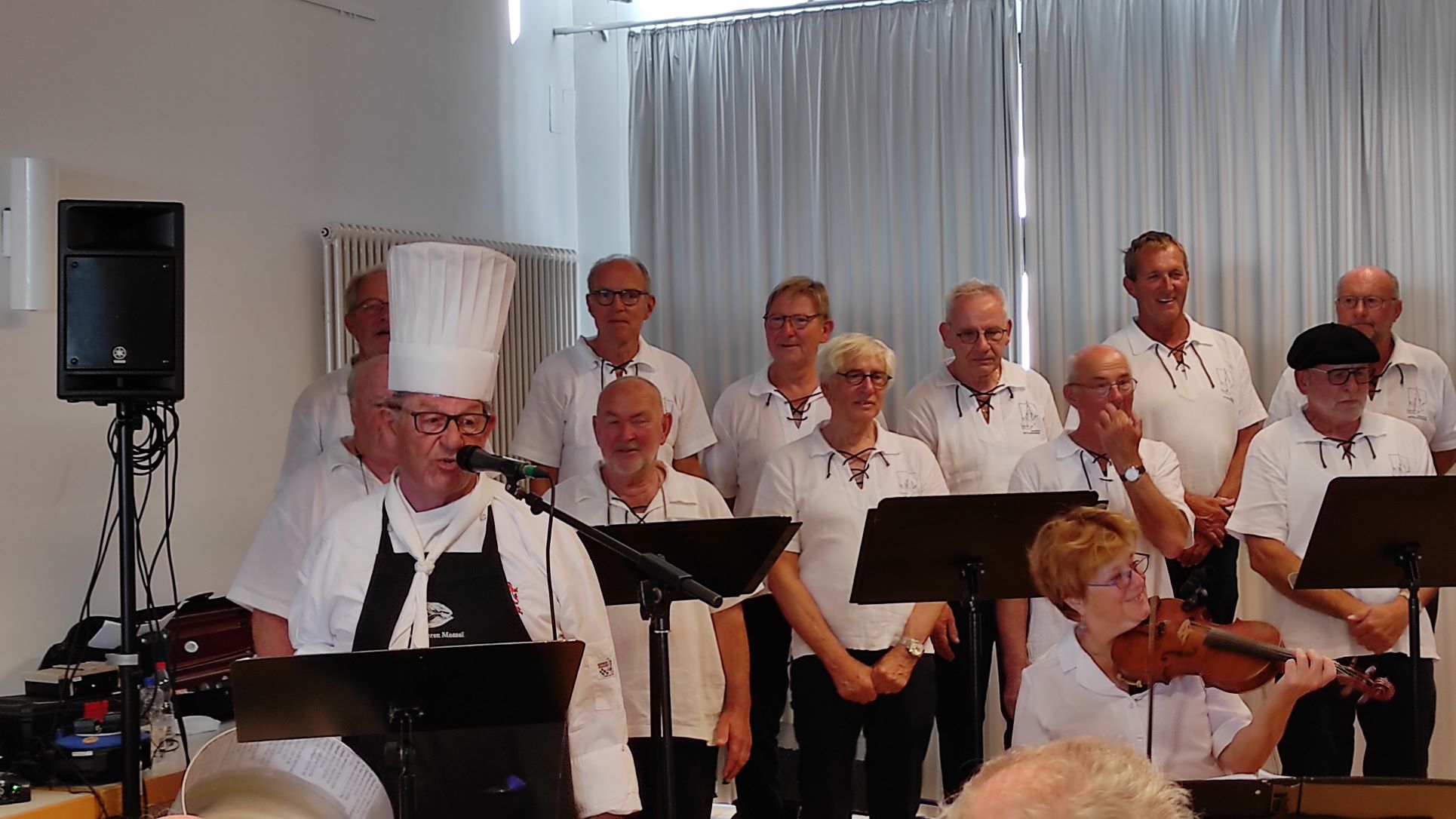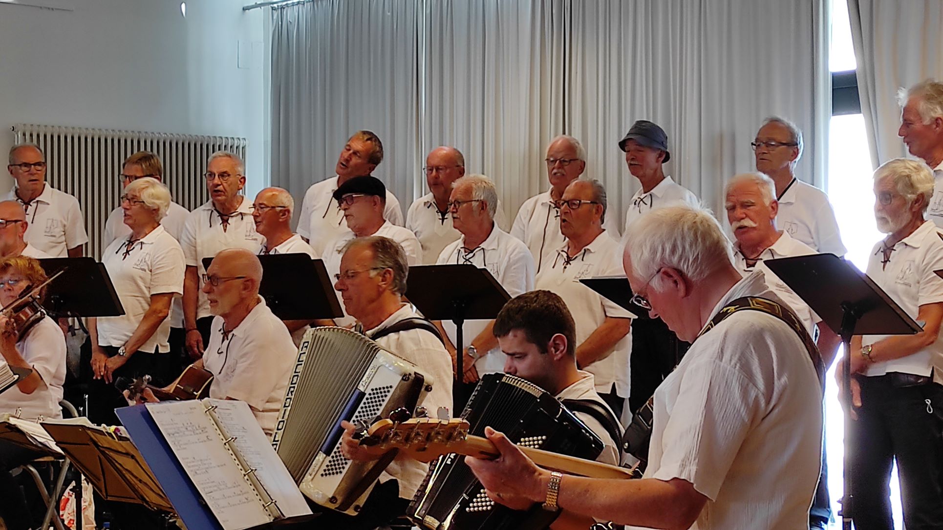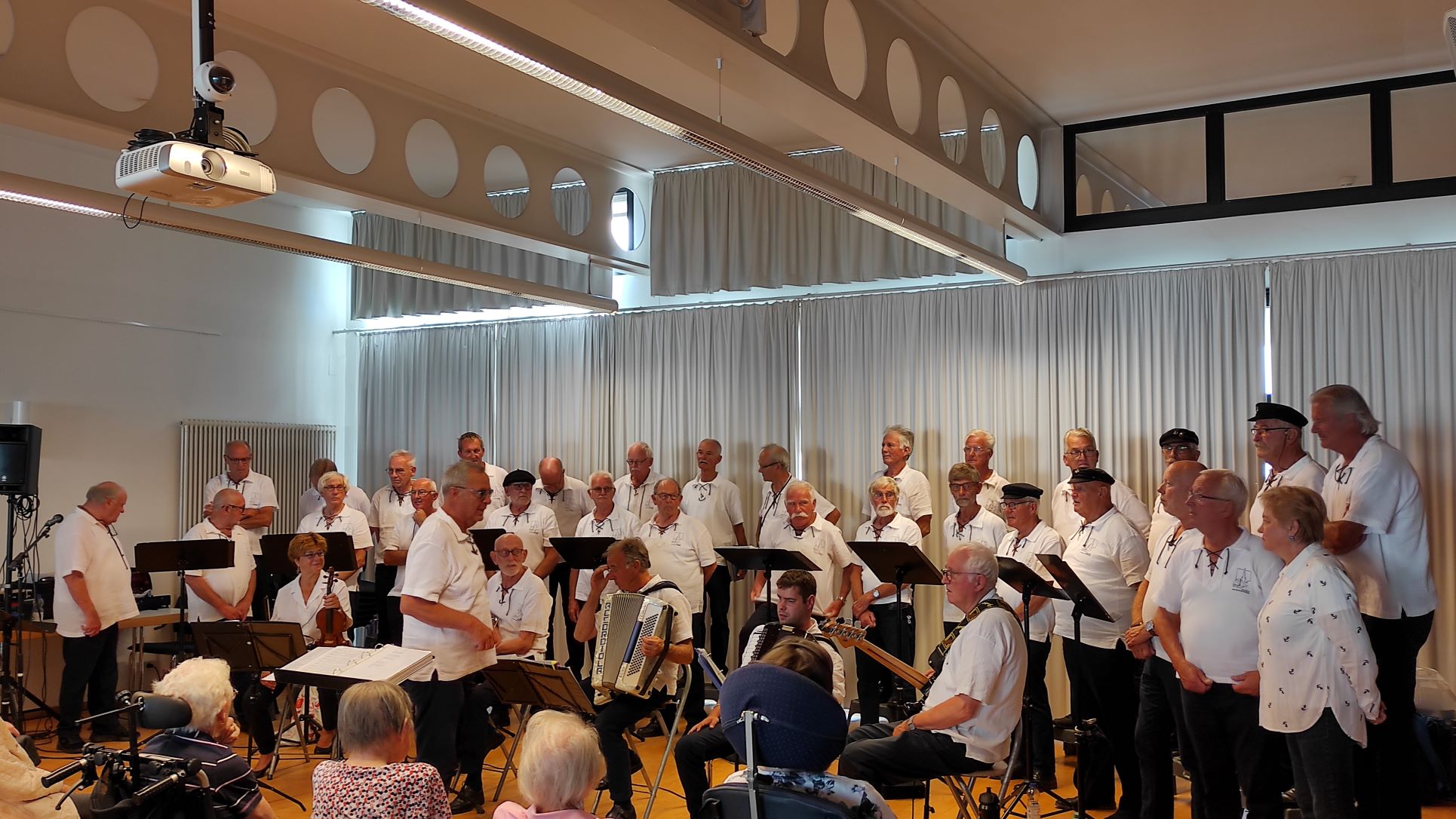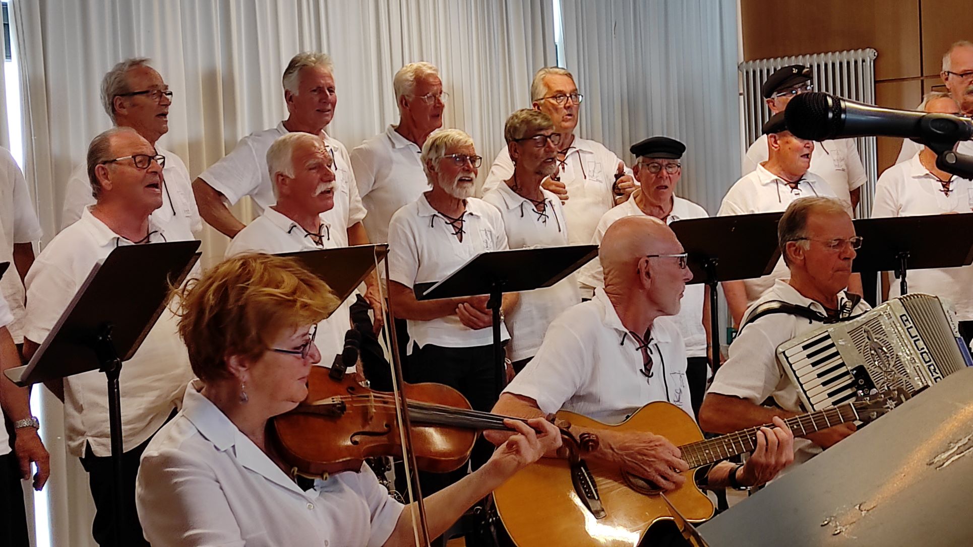 Stimmgewaltig und ebenso lebhaft begannen die in seemannstypischer Tracht gekleideten Chormitglieder das Konzert mit dem Klassiker „Rolling Home“. Binnen kürzester Zeit entstand im Saal eine Atmosphäre, die an die weite See, den Hafen und das Leben an Bord erinnerte. Lieder, wie „Sun of Jamaica“ oder „Heute an Bord“, ließen die begeisterten Zuhörer die salzige Seeluft riechen sowie den Wind und die Sonne auf der Haut spüren. Romantisch und wehmütig wurde es bei den Liedern von Freddy Quinn, wie „Heimatlos“ und „Die Gitarre und das Meer“, da diese Melodien offensichtlich viele Erinnerungen der Konzertbesucher weckten und zum Mitsingen animierten. Besonders lebhaft und stimmungsvoll wurden die Lieder durch die musikalische Begleitung mit den Instrumenten Geige, Gitarre, Mundharmonika, Bass und Akkordeon, die ja so typisch für die Seemannsmusik sind.