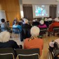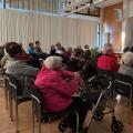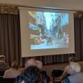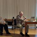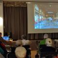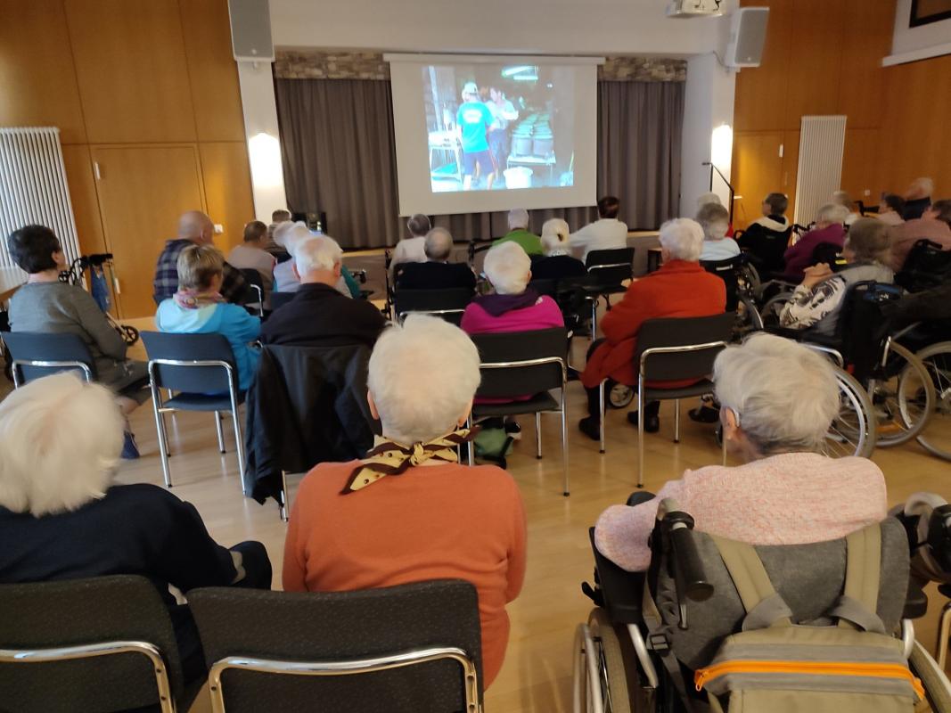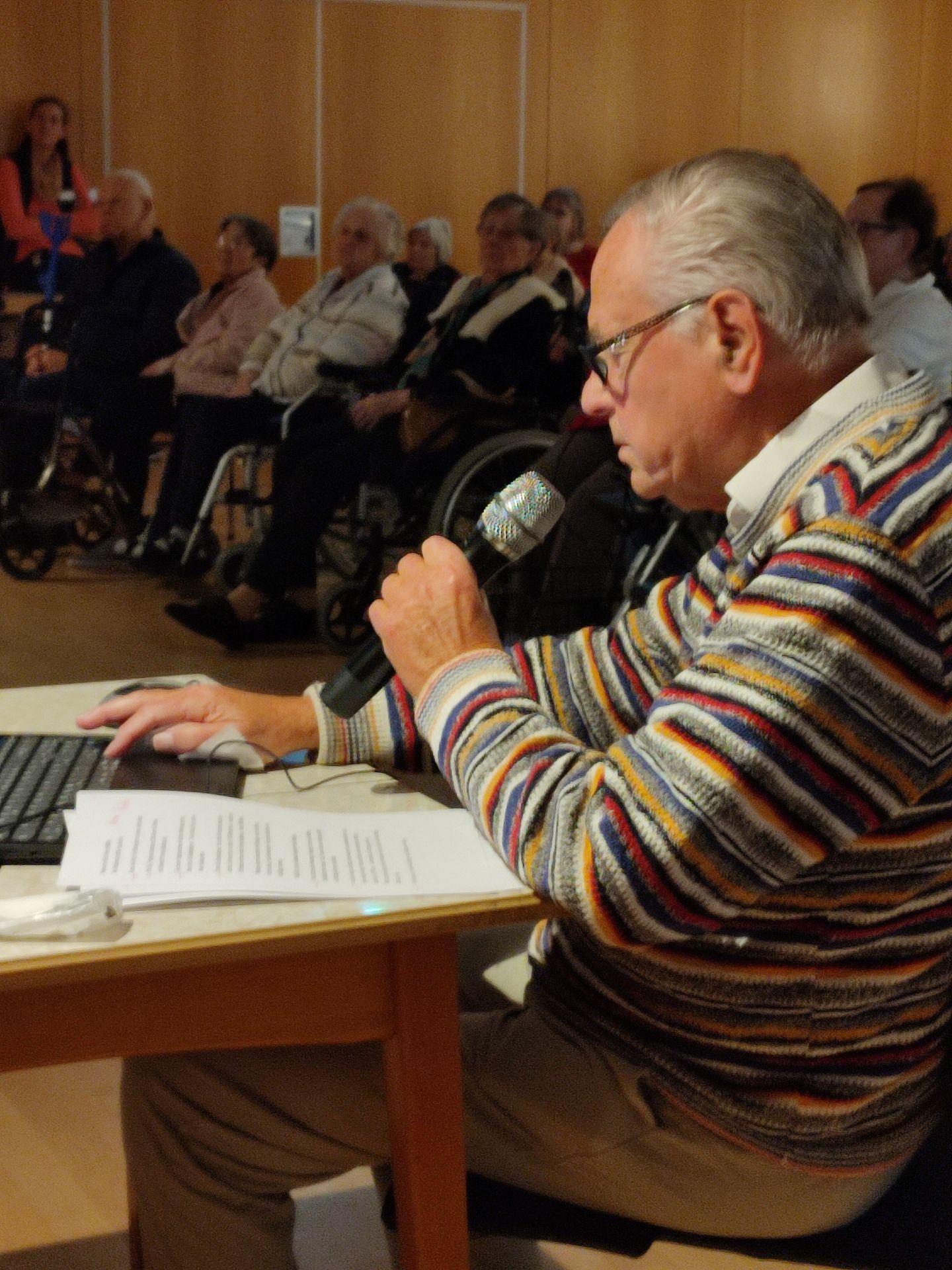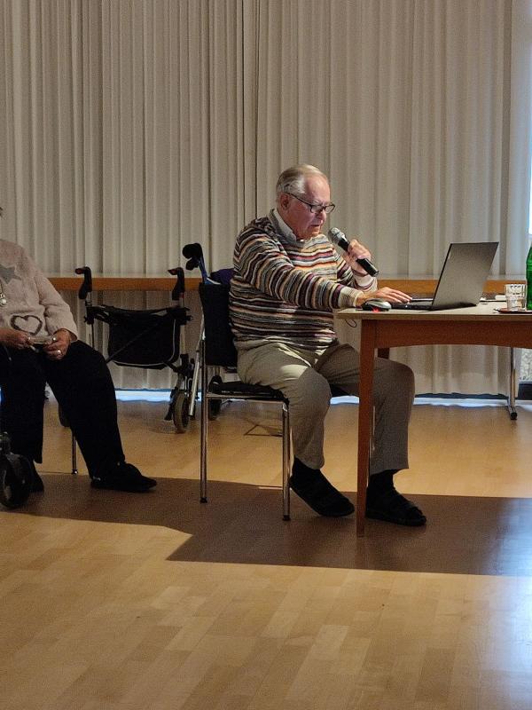 Der Vortrag im Veranstaltungssaal wurde von Martin Ulrich, einem 90-jährigen Bewohner des Hauses, gehalten. Herr Ulrich hatte die Präsentation eigenständig vorbereitet – von der Auswahl der Fotografien bis hin zur Gestaltung des Vortrags.