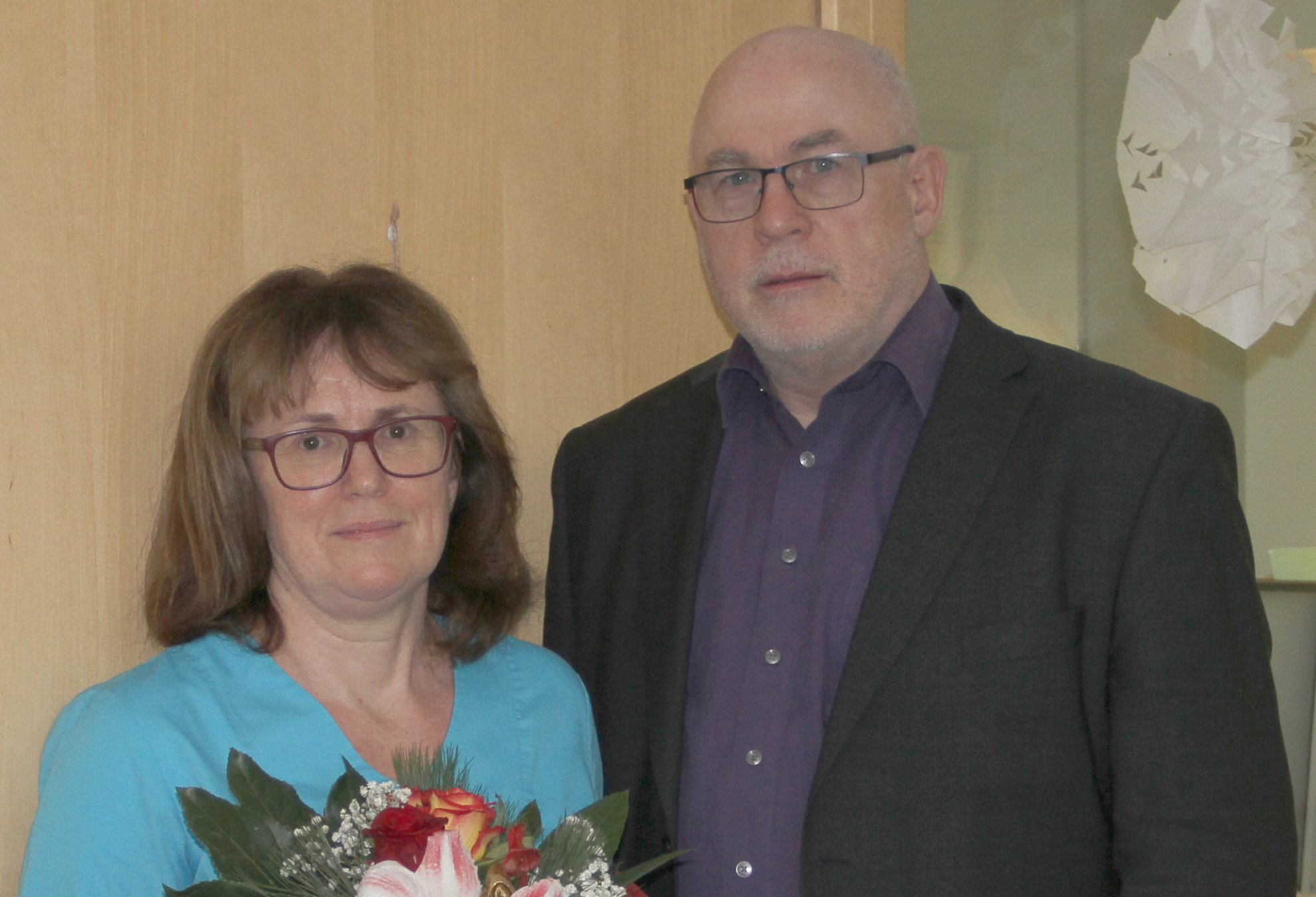 Zum Dank und als Anerkennung erhielt sie von Einrichtungsleiter Bernhard Fromme einen Blumenstrauß sowie das bronzene Signet der Franziskanerinnen vom hl. Josef, verbunden mit den besten Wünschen für die Zukunft.