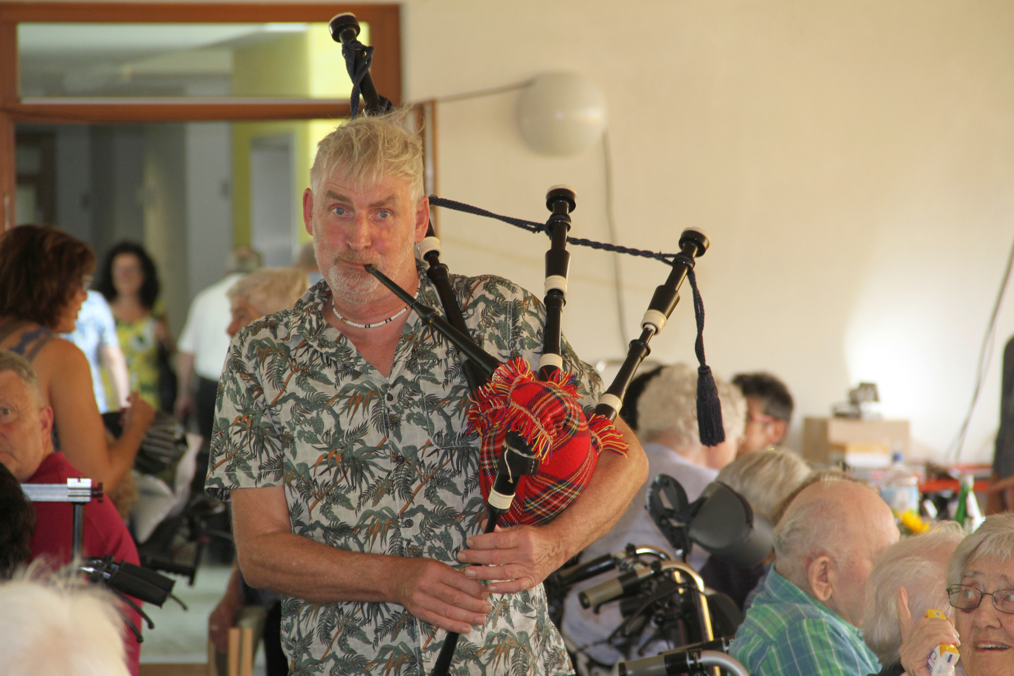 seinem Dudelsack, als er bekannte Lieder zum Besten gab.