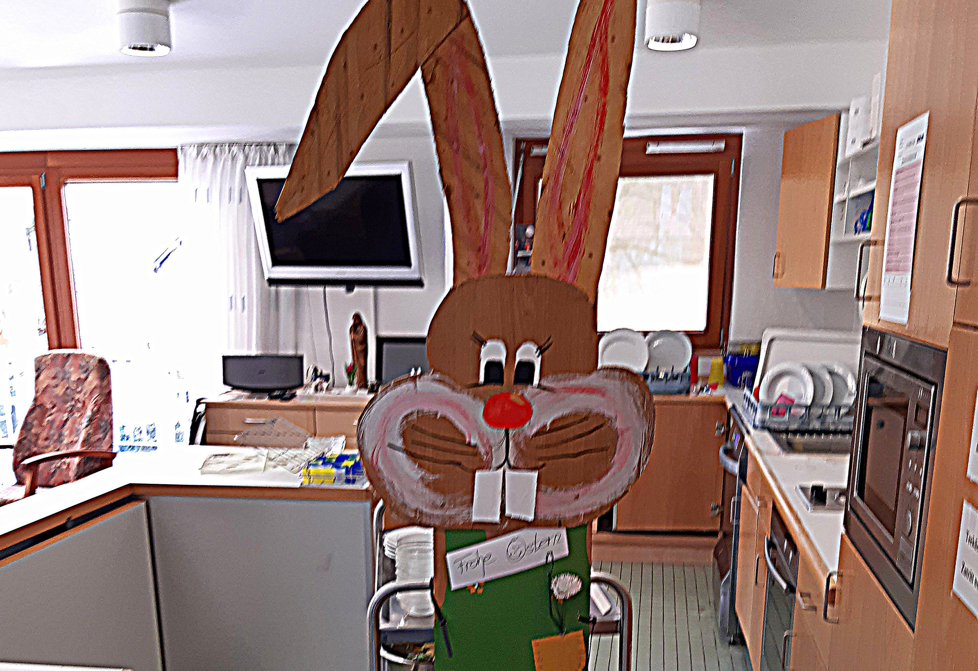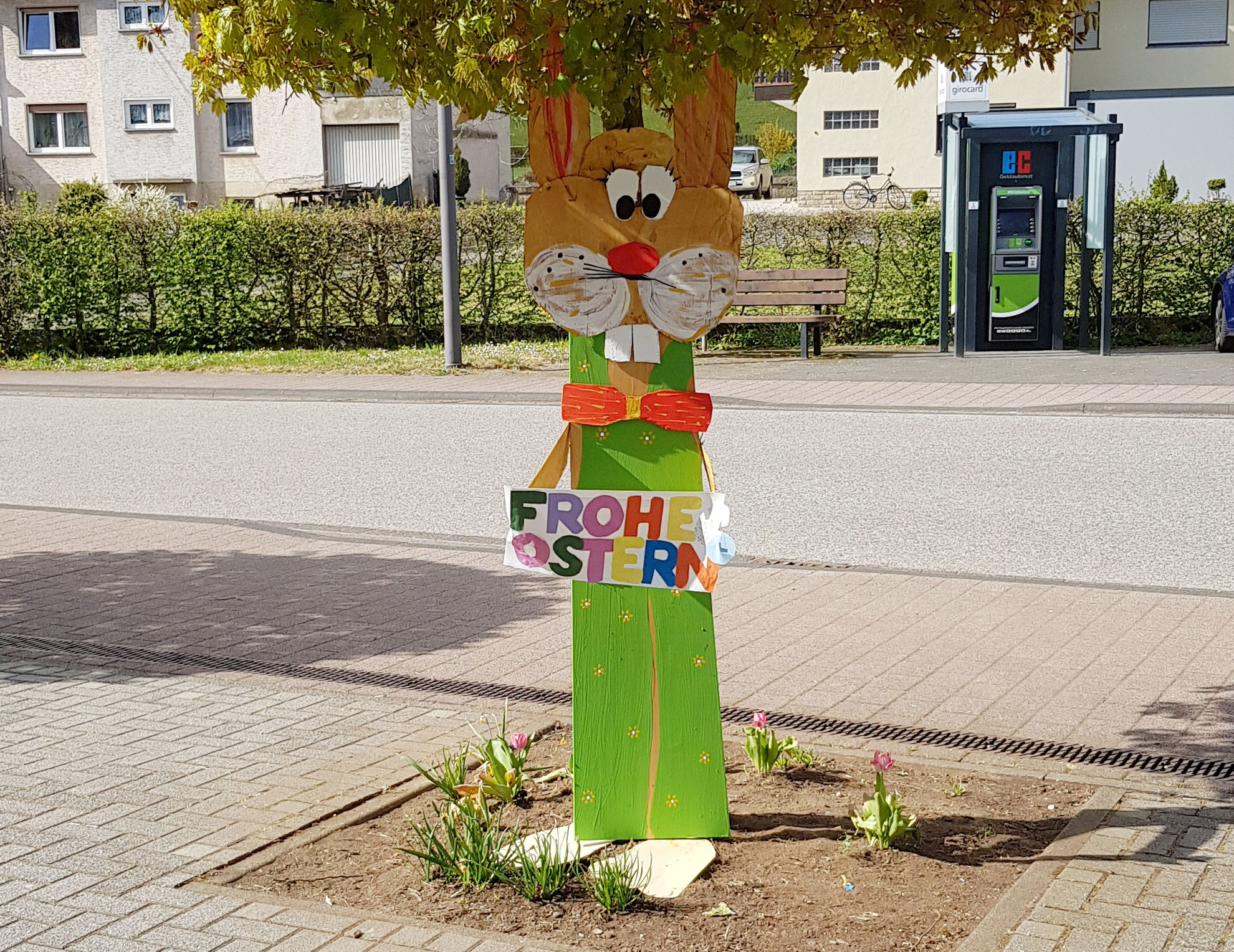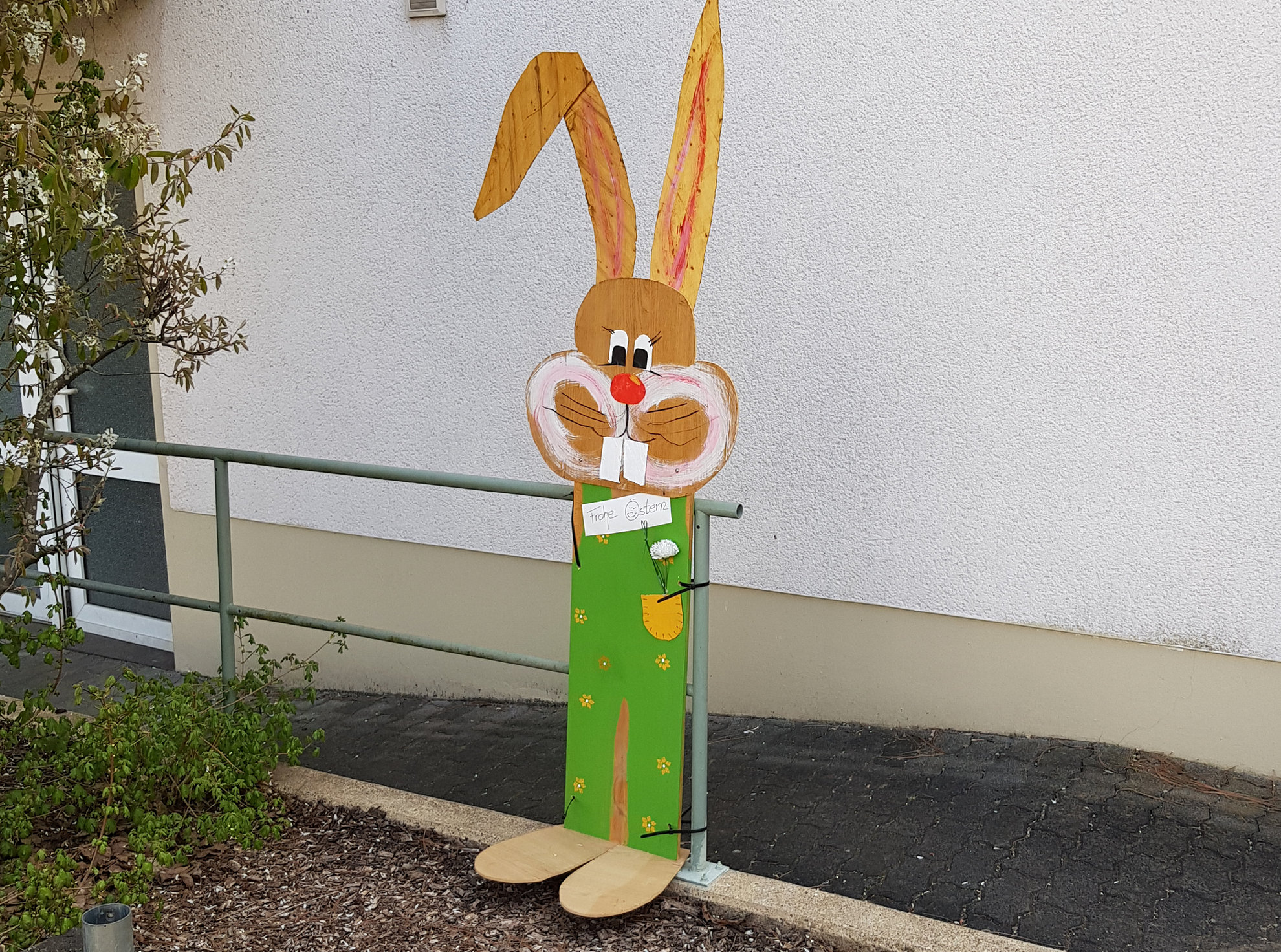 Osterhasen gebastelt und einen davon auf dem Parkplatz des Hauses aufgestellt.