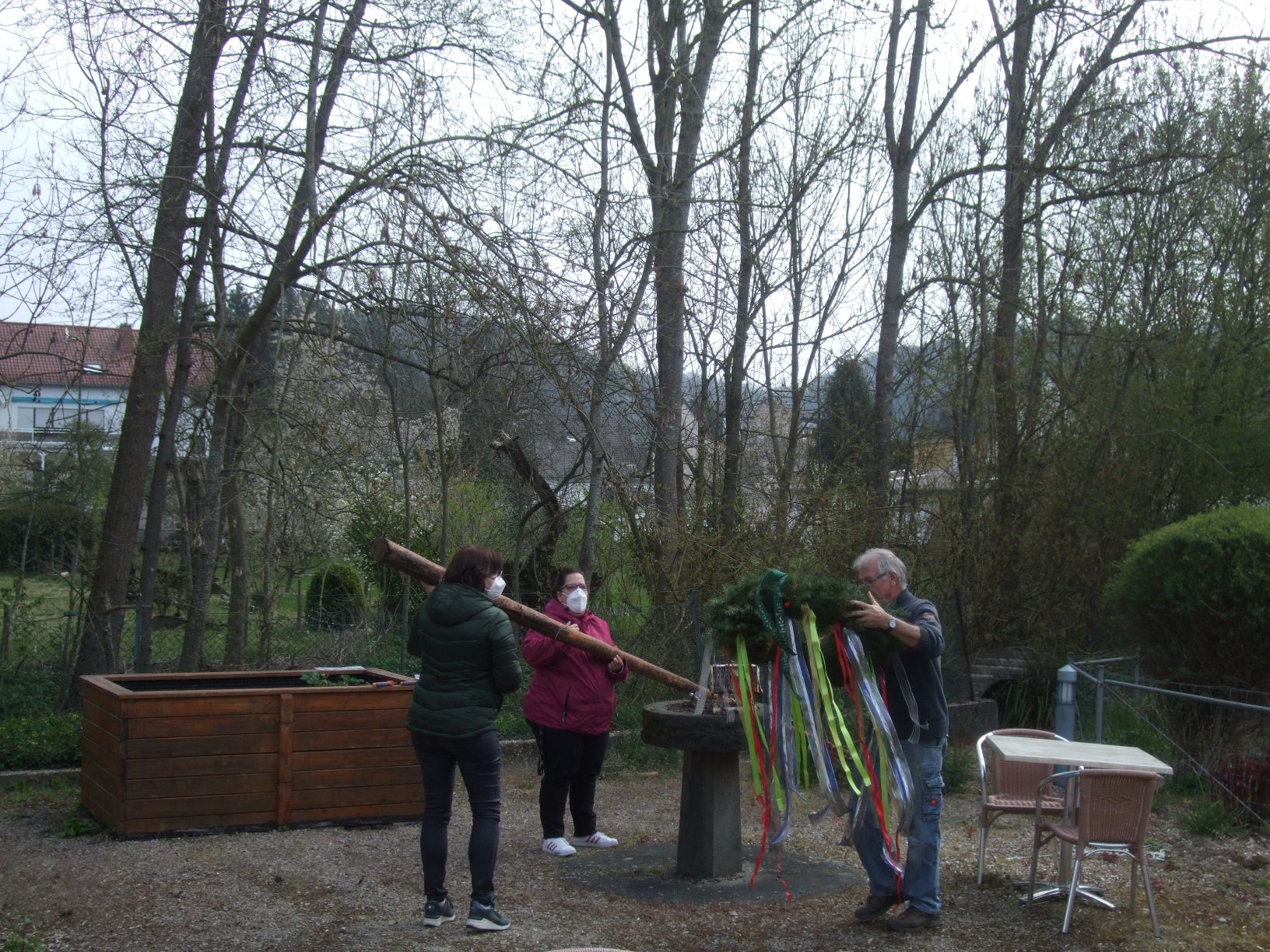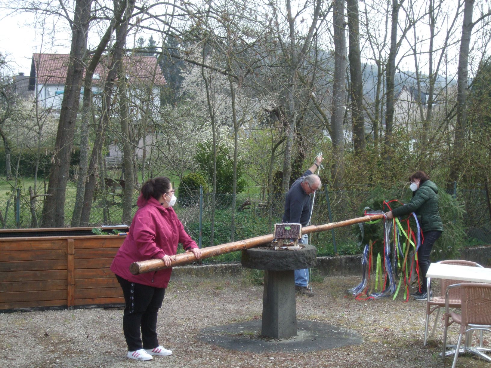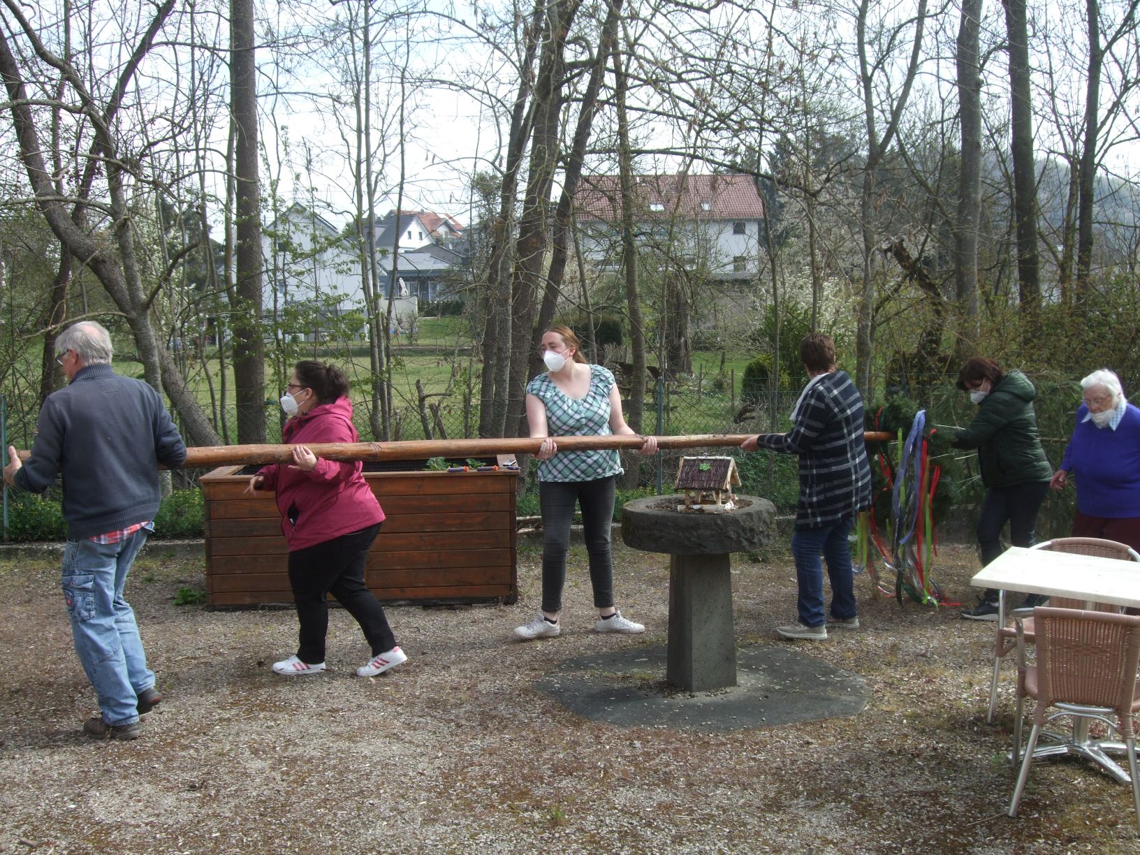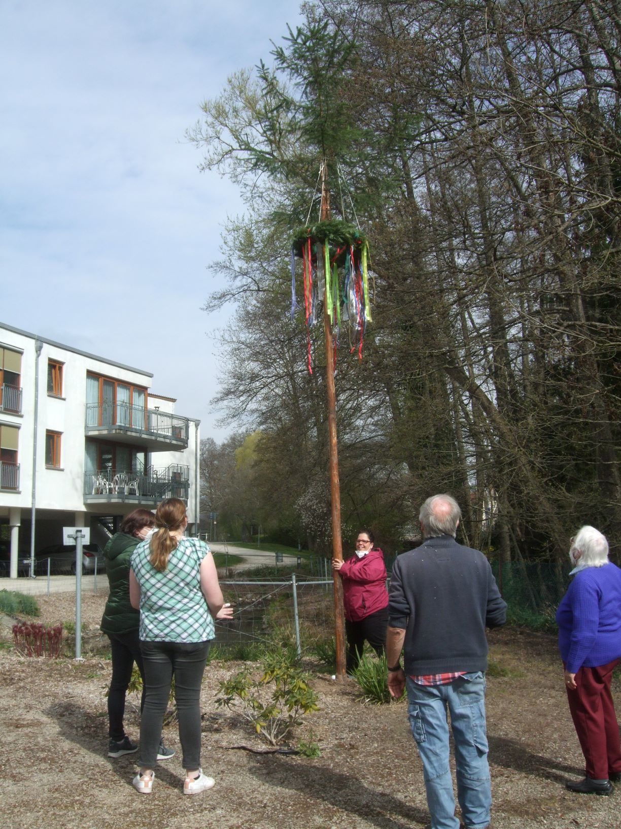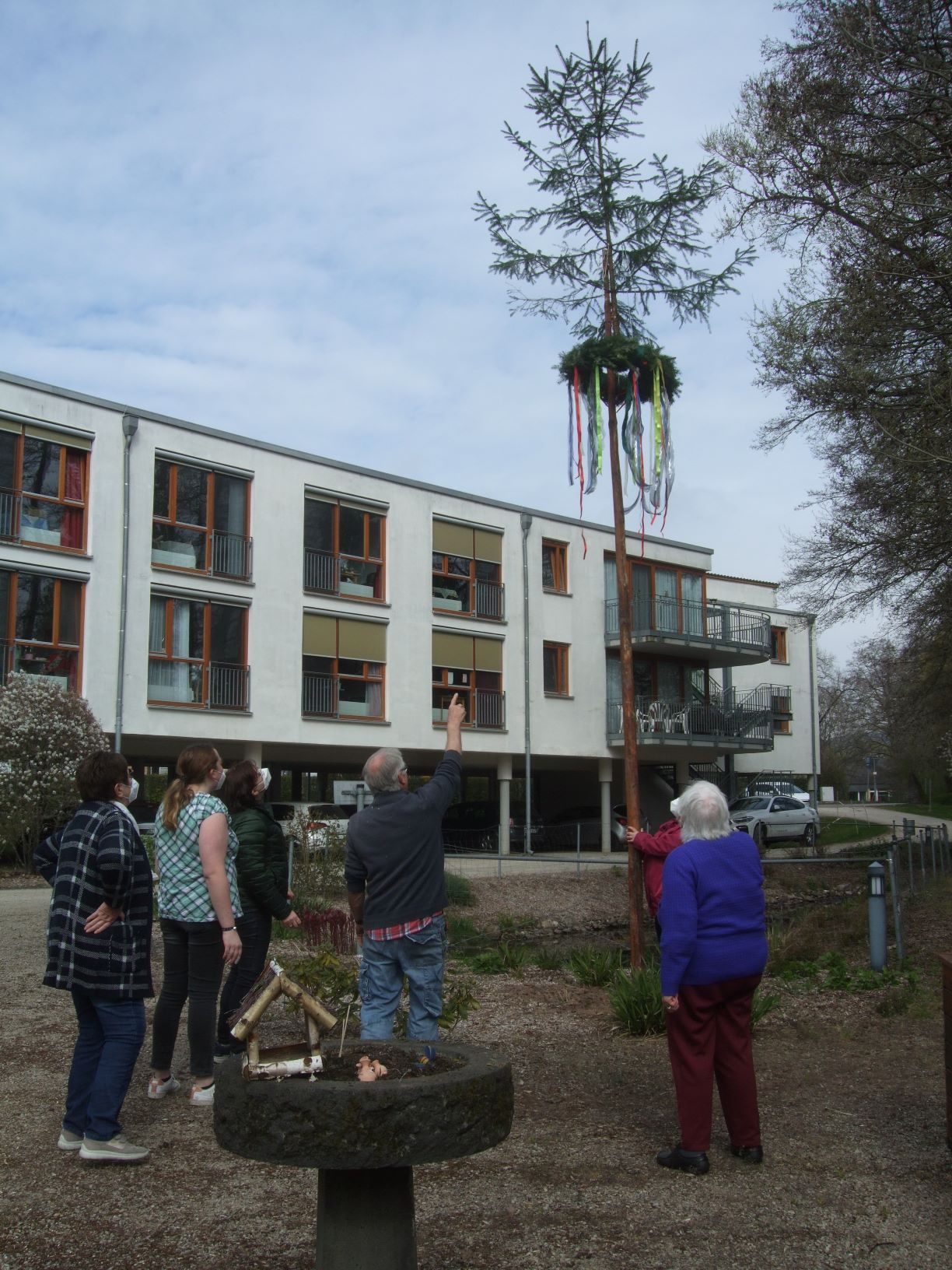 Mit tatkräftiger Unterstützung der Vorsitzenden des Heimbeirates, Margot Madel, wurde am 30. April im Garten des St. Vinzenz-Hauses der zuvor von den Bewohnerinnen und Bewohnern dekorierte Maibaum aufgestellt. Wegen der kühlen Witterung verfolgten unsere Senioren die Aktion an den Fenstern und von den Balkonen des Hauses. Auch die Kinder der Kita Körperich schauten beim Aufrichten begeistert zu und spendeten Applaus.