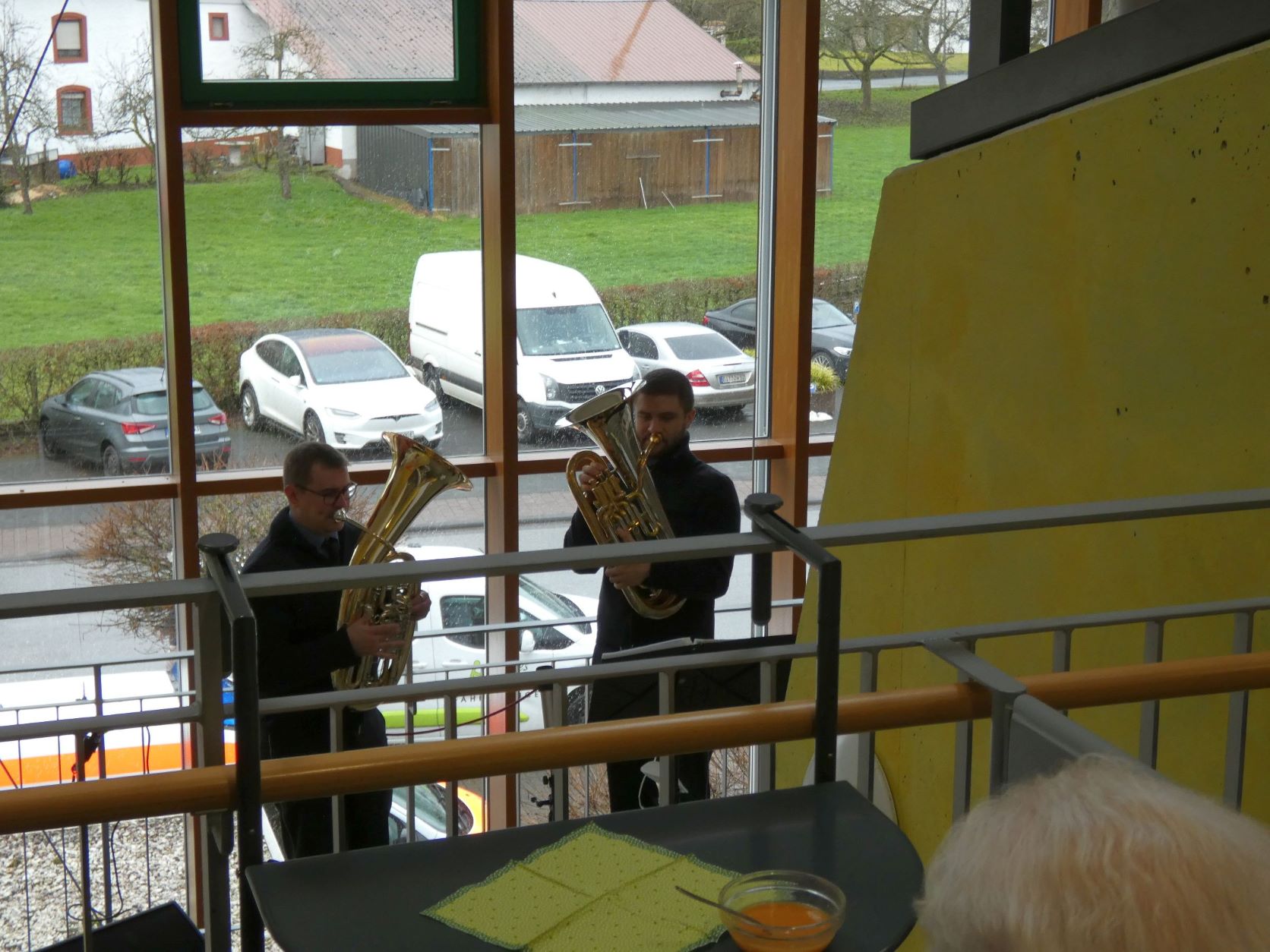 Am 20. Januar, pünktlich um 10.30 Uhr, platzierten sich die Musiker Klemens Vetter und Christopher Dehl mit Euphonium und Bariton – beides Blechblasinstrumente aus der Familie der Bügelhörner - im Treppenhaus und boten ein anspruchsvolles und breitgefächertes Programm, welches sich über ein Medley aus der Oper Carmen, ein Walzer-Medley, verschiedene Entertainer wie Andy Williams und Glenn Miller, deutsche Volkslieder und auch Schlager erstreckte. Die Bewohnerinnen und Bewohner genossen die Abwechslung und klatschten und schunkelten bei einigen Stücken begeistert mit.
