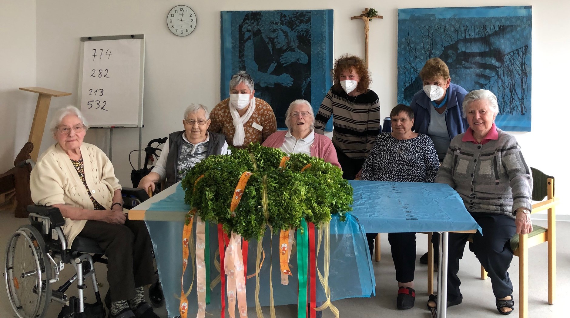 „Der Maibaum steht seither für Gedeihen und Wachstum sowie für Glück und Segen. Er dient als Zeichen des wiederkehrenden Frühlings.“ So haben es sich die Bewohner des St. Vinzenz-Hauses nicht nehmen lassen einen tollen Kranz, mit Bändern geschmückt, zu binden.