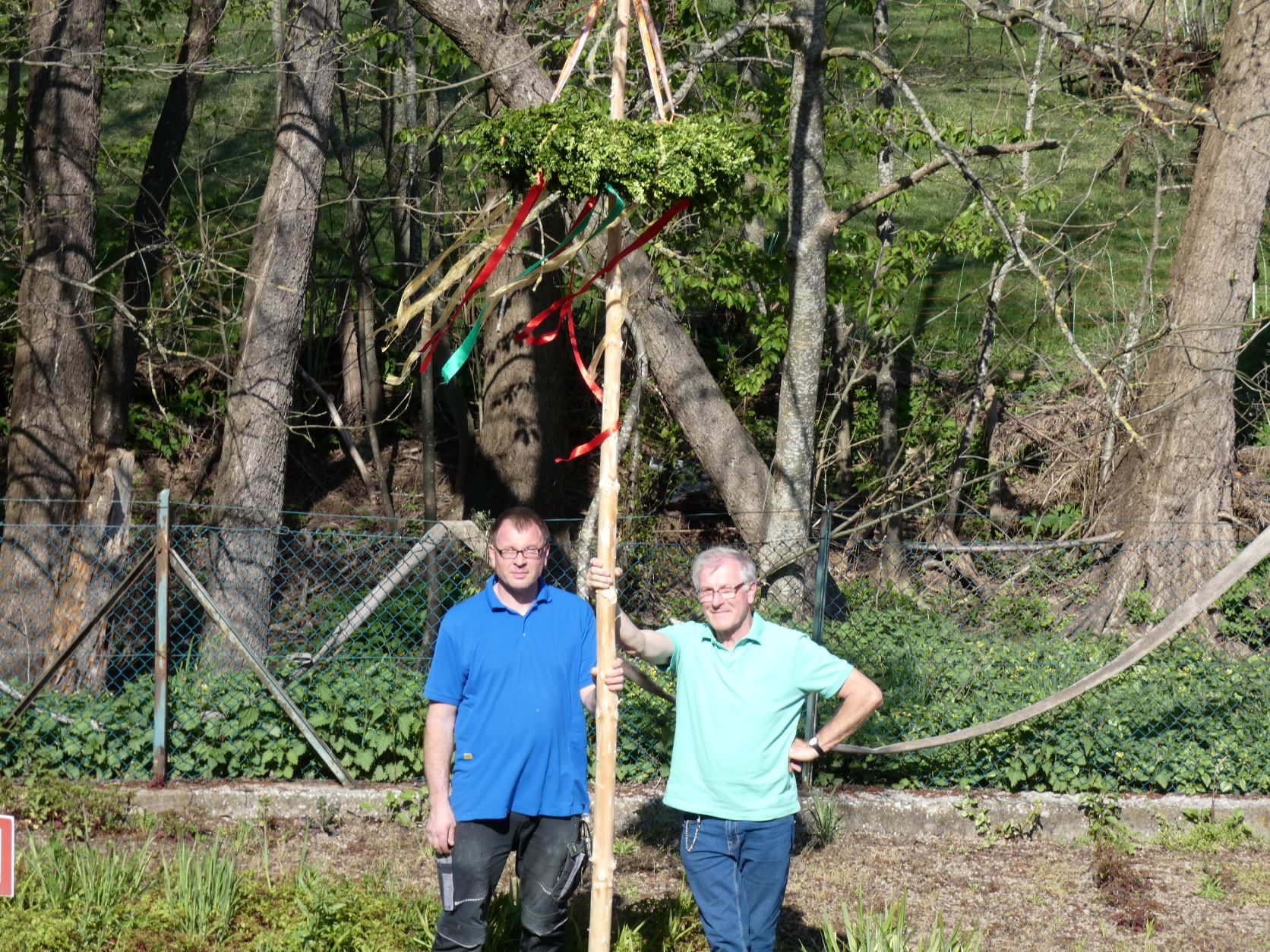 Traditionell wurde dann der Maibaum bei prächtigem Frühlingswetter von unseren Haustechnikern aufgestellt. (v.l.) Markus Traut, Manfred Moos.