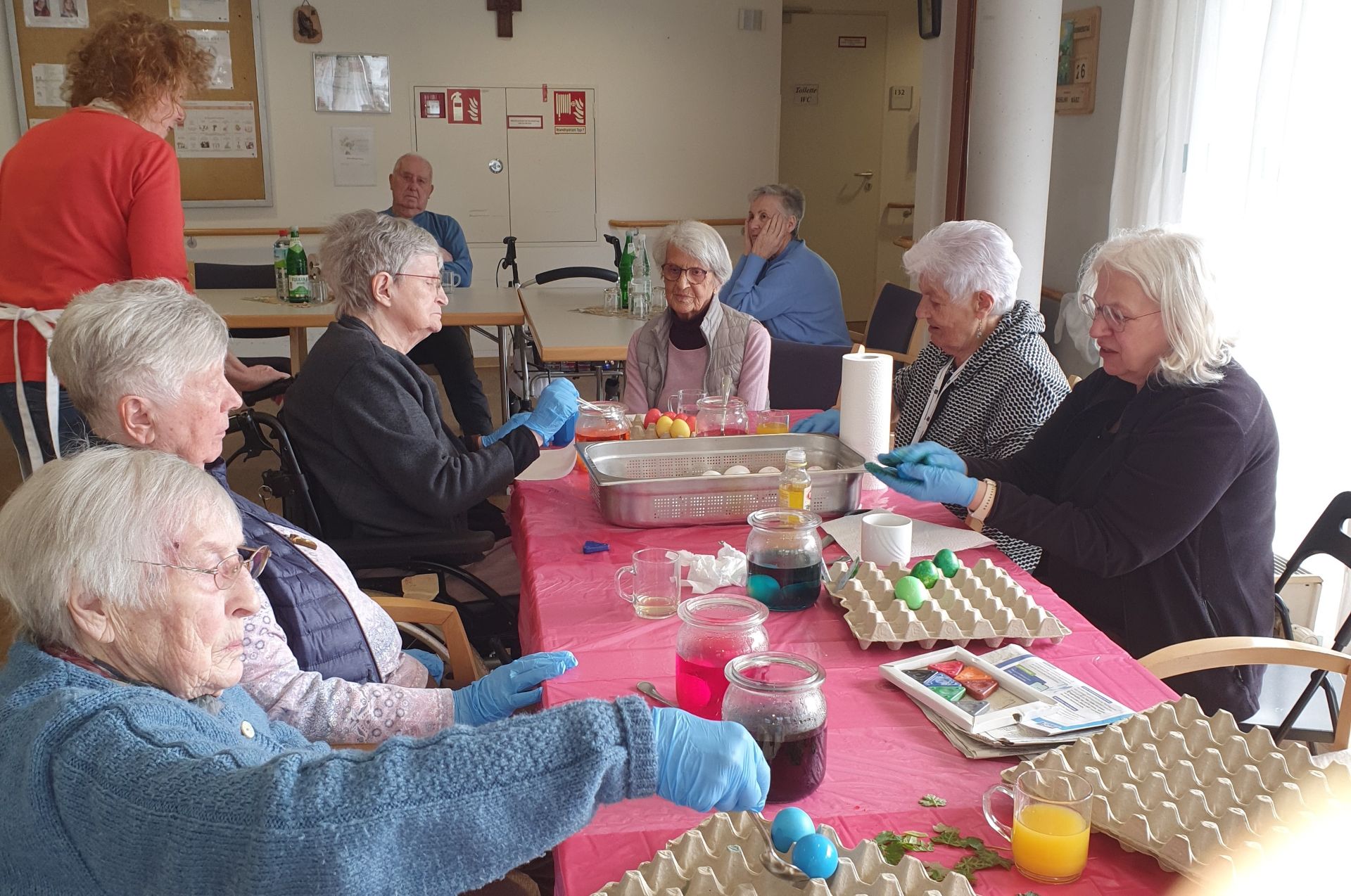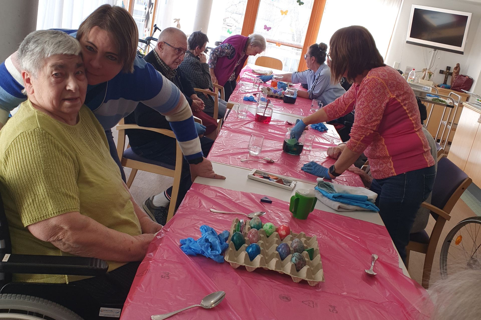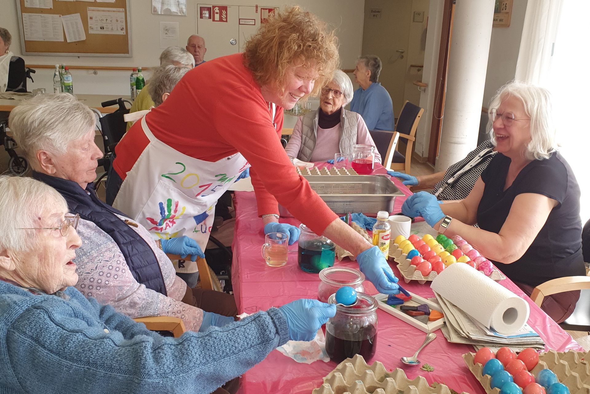 Das Ostereierfärben fand in diesem Jahr gemeinsam mit Bewohnern und Angehörigen statt. Alle Mitwirkenden hatten viel Spaß beim Färben und sie konnten Stolz auf die bunten "Kunstwerke" sein. An Ostern erfüllten die Eier ihre Bestimmung und erfreuten die Bewohner des Hauses.